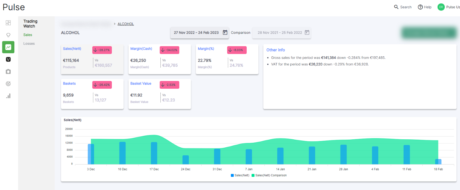 - The ability to change the time period being analysed. Pulse will automatically compare your KPIs against the same time period the previous year, taking into account calendar differences (ie a Monday will always be compared with the equivalent Monday the previous year).