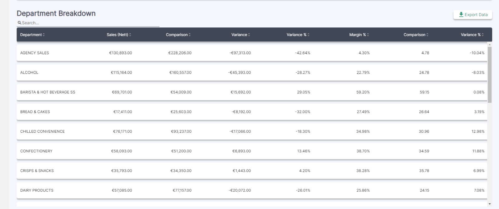 - The ability to view your key metrics across multiple stores, a single store, a department, or a category, all the way down to a single product. You can zoom out as wide or drill down as far as you wish to get the information you need!