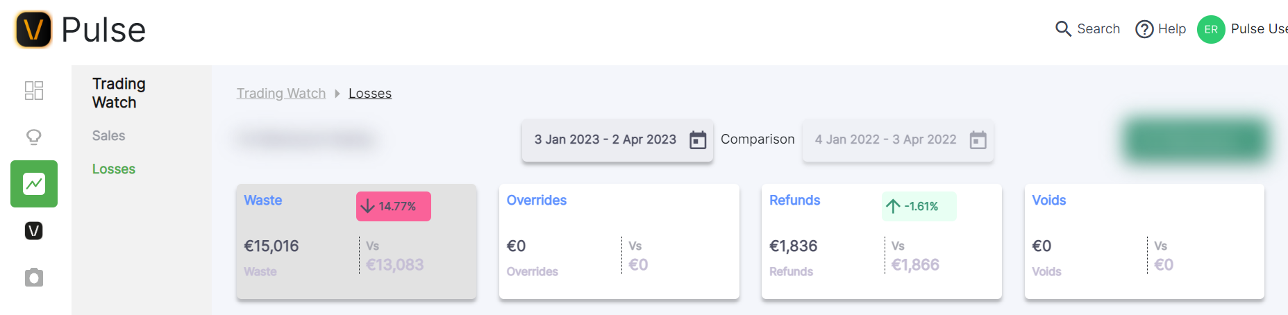 By clicking 'Losses' on the left hand sidebar, you'll be able to see metrics on Waste, Overrides, Voids and Refunds.