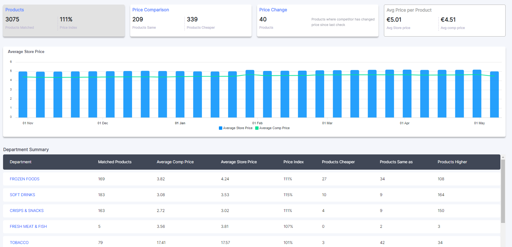 The store is given an index, which the summed total comparison of prices. In the example below, across 3075 products, the store is 11% more expensive.